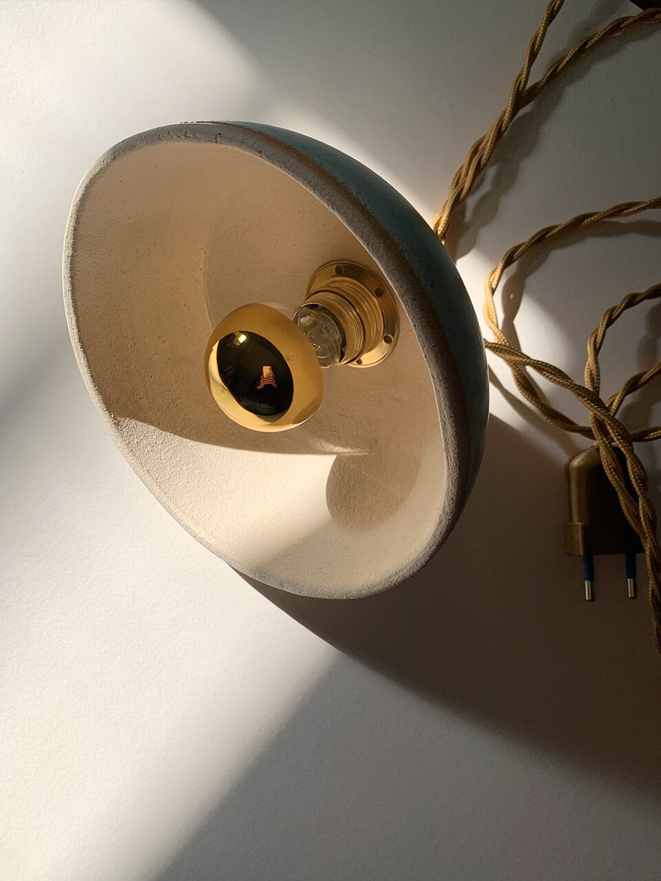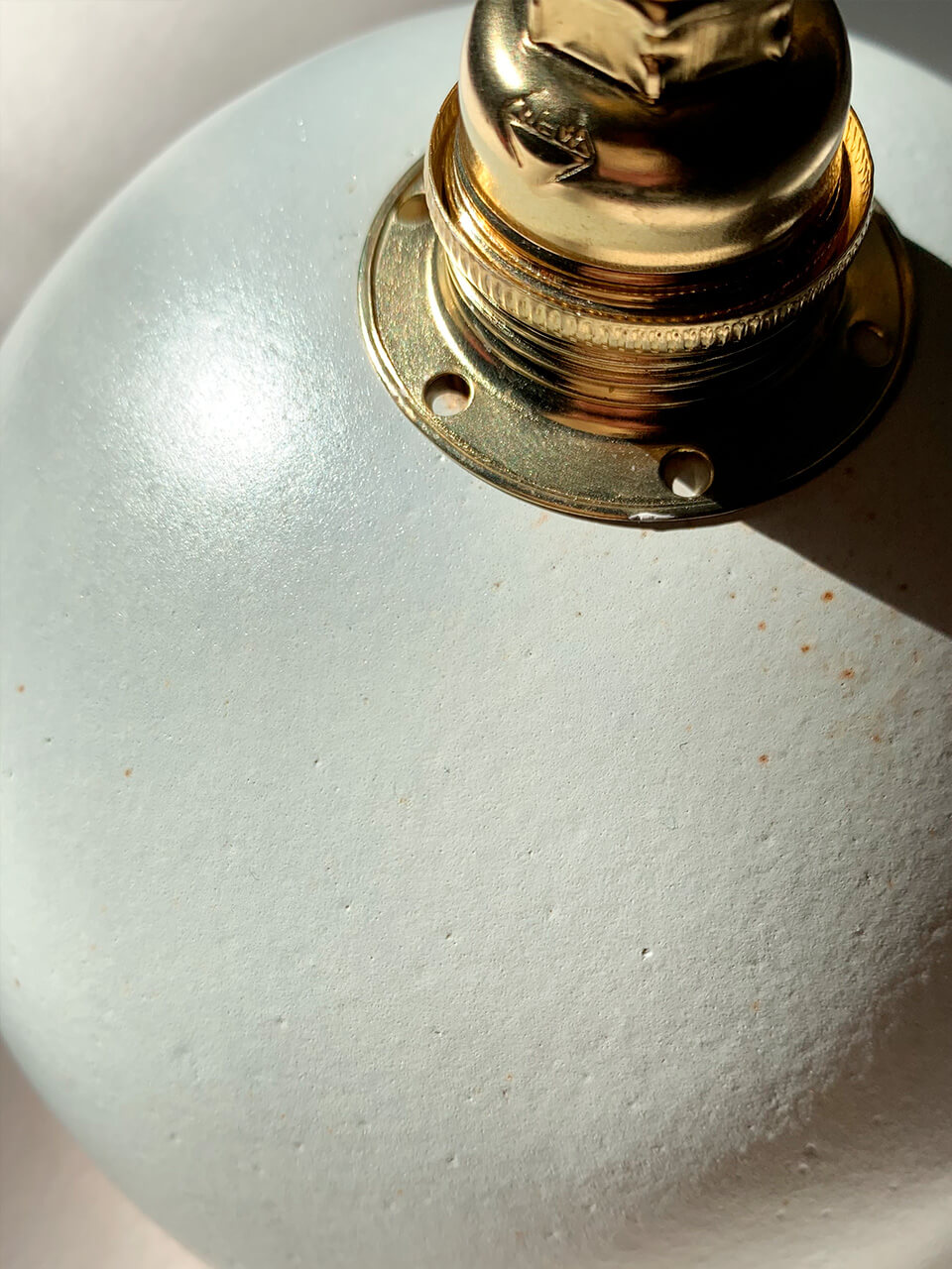 Pièce unique, l’abat-jour est en grès blanc finement chamotté.